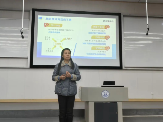 讲座伊始,何书记并未直接切入理论,而是结合当前各地经济发展局势与权威时报报道,从宏观层面系统梳理了当前大学生的创业与就业整体形势,同时围绕热门创业领域、新兴就业方向等核心内容展开细致讲解。她通过数据对比与案例分析,帮助同学们理清职业发展路径,有效告别就业迷茫,进一步拓宽了对职场生态的认知边界。其间,为引导同学们将个人发展与国际视野相结合,并通过提问互动的方式,邀请同学们分享对这些事件的了解与感受,既活跃了现场氛围,也让大家深刻认识到国际局势对就业市场的潜在影响。