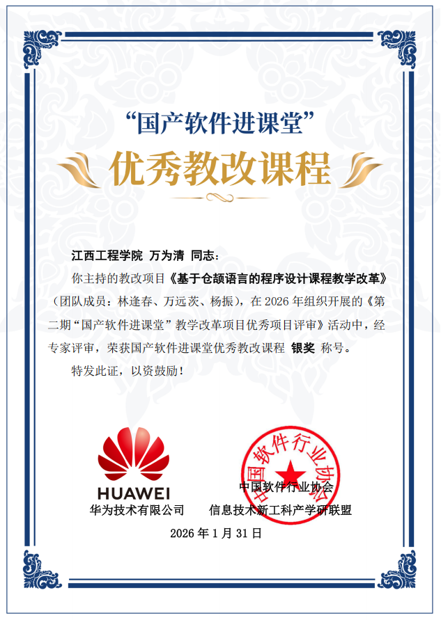 近日,中国软件行业协会与信息技术新工科产学研联盟联合公布了第二期“国产软件进课堂”教学改革项目优秀项目评审结果。我院教师万为清主持的《基于仓颉语言的程序设计课程教学改革》项目在包含复旦大学、兰州大学、北京工业大学等全国众多院校的参评项目中脱颖而出,荣获“优秀教改课程”银奖。这一成果标志着我校在推动国产软件融入教学体系、培养适配产业需求的创新型人才方面取得了国家级认可。